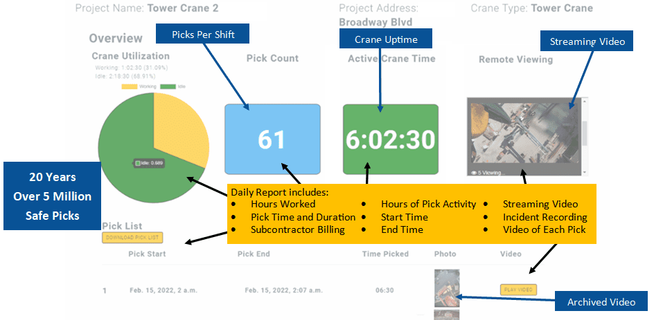 HookCam provides you all the metrics you need to keep your job site running smoothly and efficiently. With daily reports, archived video footage, and crane uptime to name a few, HookCam gives you the full overview!