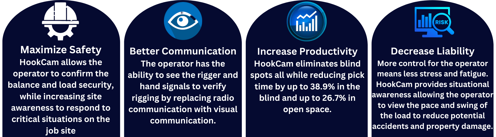 HookCam is designed to eliminate communication issues when operating in the blind, this gives the operator a second set of eyes allowing them to better communicate with the rigger and respond to critical situations. With the HookCam, the operator has more control of risks on the job site and can move safely and efficiently.